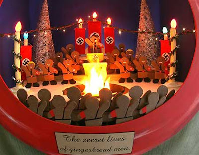 «Keith McGuckin, un «artista» estadounidense de 50 años, decidió exponer en el escaparate de una tienda de hardware de Oberlin (Ohio), un día antes de Hanuká (la Navidad de los judíos), un diorama en el que decenas de hombres de jengibre acudían a un mítin nazi.